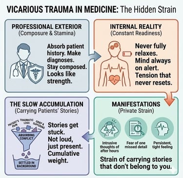 This does not mean you are burned out. It means you have been exposed to years of suffering, uncertainty, life-and-death responsibility, and the emotional residue of witnessing pain you could not take away. This is how vicarious trauma typically appears for physicians. It is steady, cumulative, and rarely discussed.