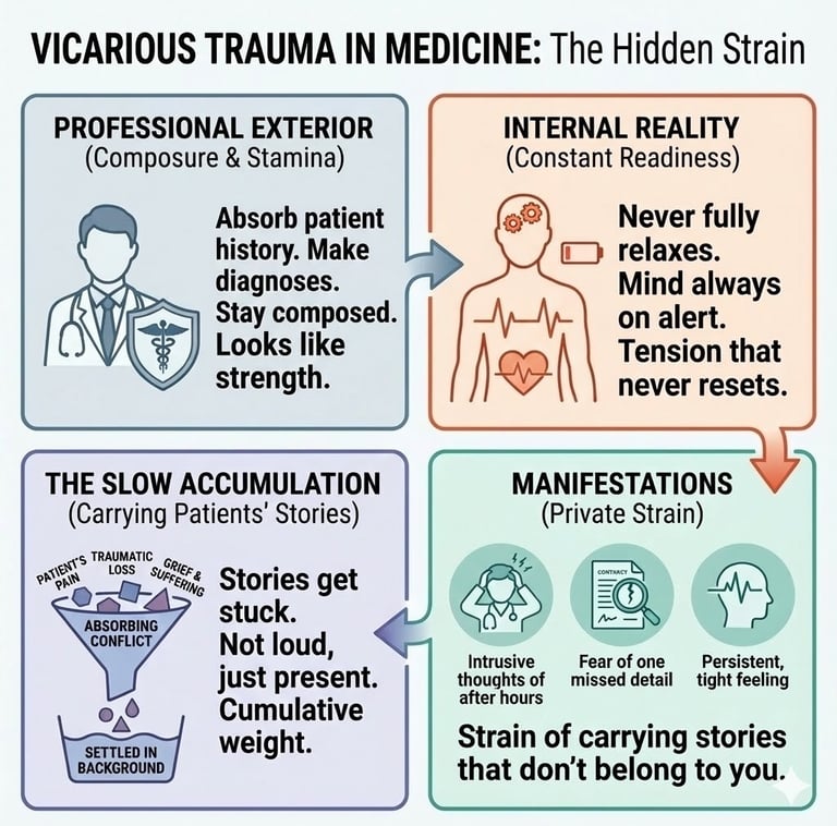 That slow accumulation is how vicarious trauma develops in medicine. It rarely announces itself. It shows up in how your system stays alert, the way your mind runs through scenarios after hours, and the way your body reacts when the next shift begins. No dramatic collapse, just tension that never fully resets.
